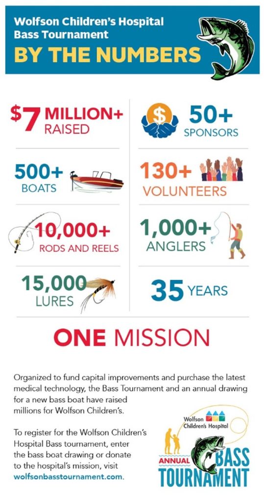 To register for the Wolfson Children’s Hospital Bass tournament, enter the bass boat drawing or donate to the hospital’s mission, visit wolfsonbasstournament.com.
